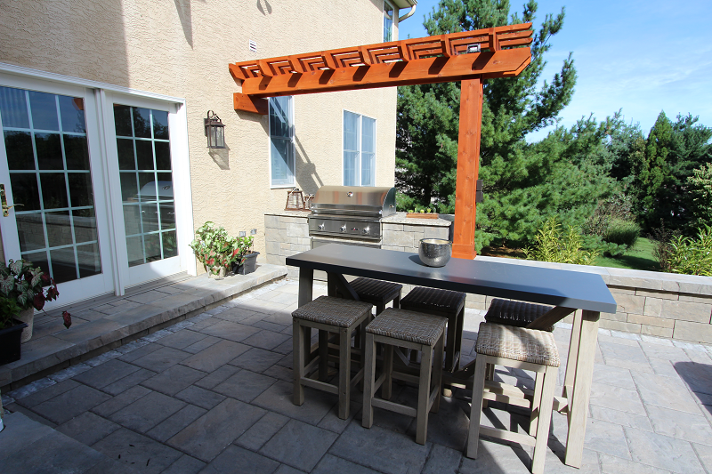 After- The new built in kitchen and grill are right next to the door for convenient transport of cooking items. A pergola adds a nice bit of decor and a bar with chairs offers nearby dining.