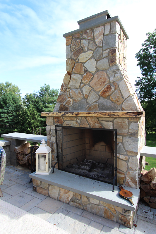 After- Techo-Bloc Retaining walls and seating located near outdoor kitchen and dining, adjacent to the cozy fireplace area.