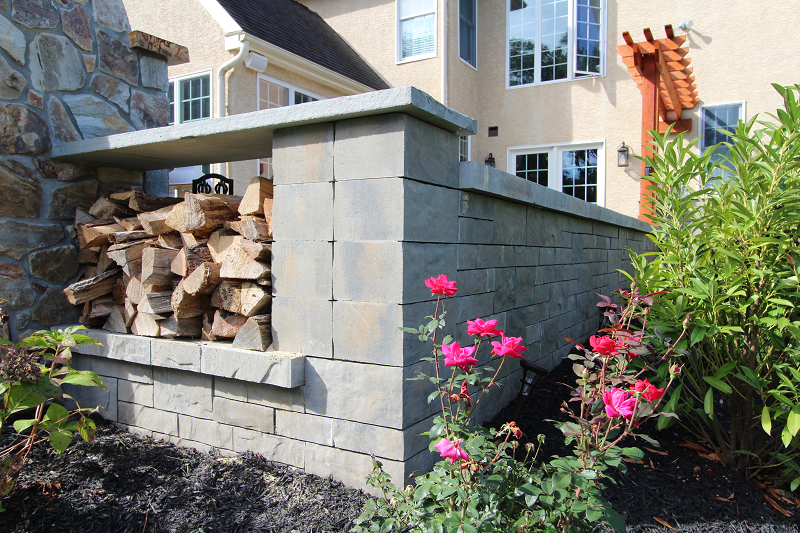 After- Techo-Bloc Retaining walls and seating located near outdoor kitchen and dining, adjacent to the cozy fireplace area.