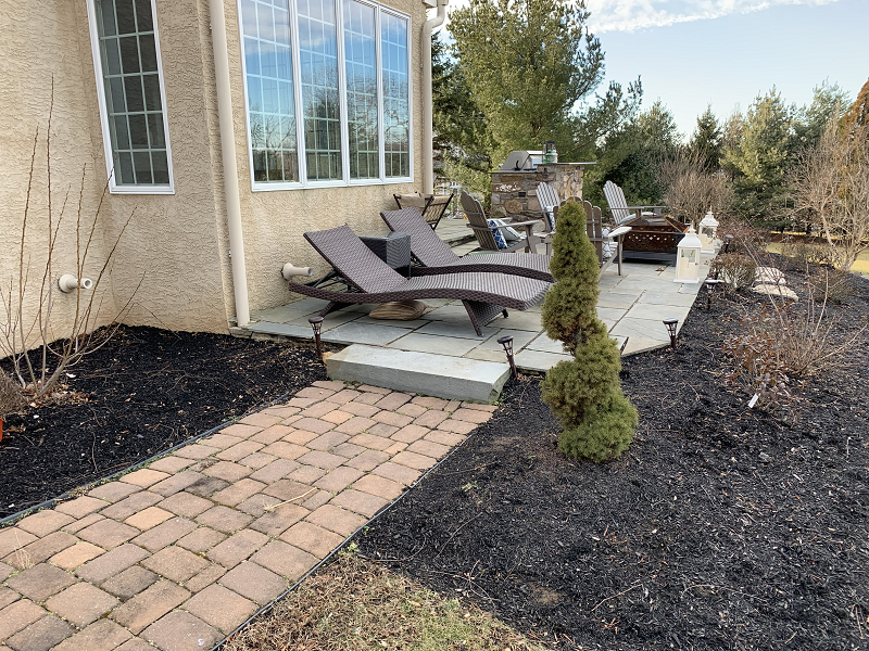 After- A new Techo-Bloc walkway leads to patio made with Techo-Bloc Blu60 pavers. The space includes new chairs, shrubs, and a seating area around a natural stone veneer fireplace.