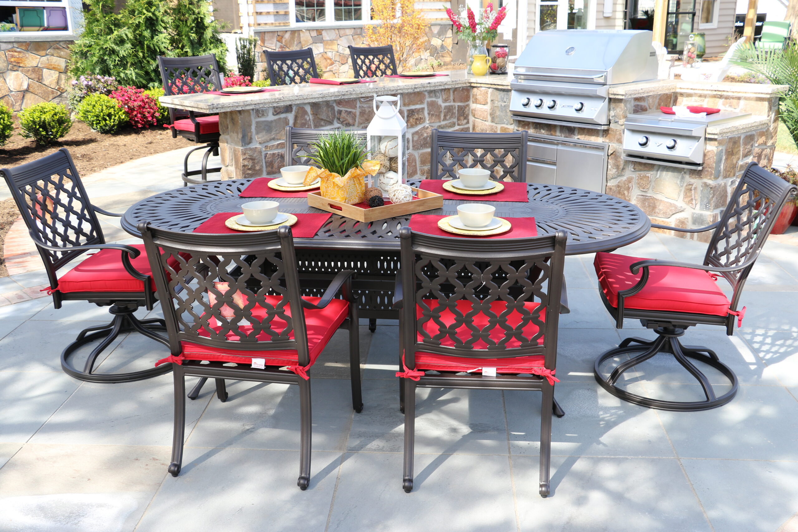 Functionality aside, outdoor furniture brings style to your space. Whether you choose a simple look— a wicker or aluminum dining table with matching chairs, for example— or perhaps a more elaborate option— such as a teak table and chairs, seating brings the comfort of the indoors outdoors. If you entertain large groups, you can incorporate several dining options, including bar seating, which is also great for small, casual meals. To further improve the appearance of your dining areas, you can accentuate your furniture with an outdoor rug.