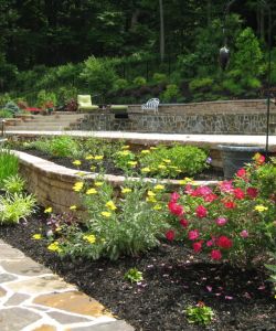 - Landscaping (Pool) Ornamental Grasses, Summer flowering Perennials and evergreen Shrubs surround the water feature of this inground pool