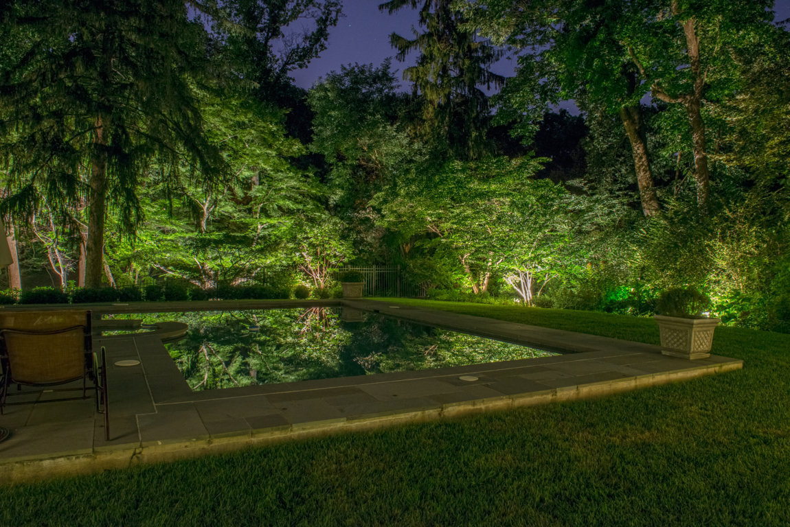 Homeowners who have invested time and money into a beautiful landscape or special architectural home features often want those elements to be visible at night as well as during the day. In fact, in the Main Line area, many home landscapes are even more beautiful and dramatic at night when the right outdoor residential lighting is in place. Uplighting can be used for more than just adding security. Placed correctly, uplighting can add elegance and grandness to a home’s façade. Intricately planted and trimmed trees, shrubs and other aspects of your softscape can be shown to best advantage with a combination of uplighting and path lights or lamp post style lighting.